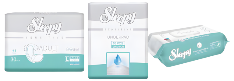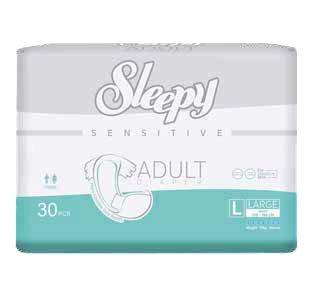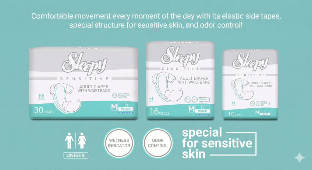Sleepy Sensitive Adult Diapers are developed with sensitive skin in mind. Their soft textile surface, extra-fast absorbent layer, and leak-proof barriers provide comfortable and secure use throughout the day. Flexible waistbands and breathable side panels allow the skin to breathe, while the wetness indicator provides convenience.