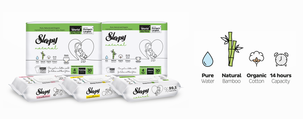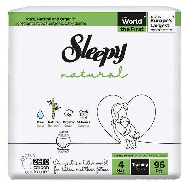 Sleepy Natural Baby Diapers offer unique, nature-inspired care for babies' delicate skin with their soft outer surface woven with pure water, natural bamboo fibers for rapid absorption, and organic cotton fibers that enhance dryness.